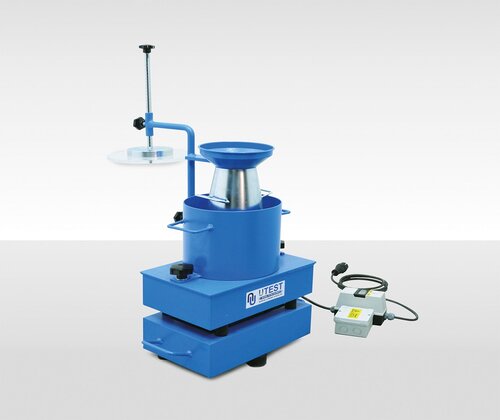 Consistomètre modèle UTC-0560E conforme à la norme NM EN 12350-3 pour la détermination de la consistance du béton frais au moyen du temps de Vébé. L'unité se compose d'une table vibrante, d'un seau cylindrique, d'un cône d'affaissement, d'un disque transparent épais avec entonnoir de remplissage et tige de piquage.